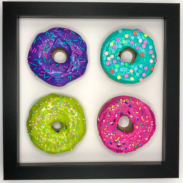 4 small donuts in 8x8 shadow box frame - Purple, Turquoise, Lime, Pink