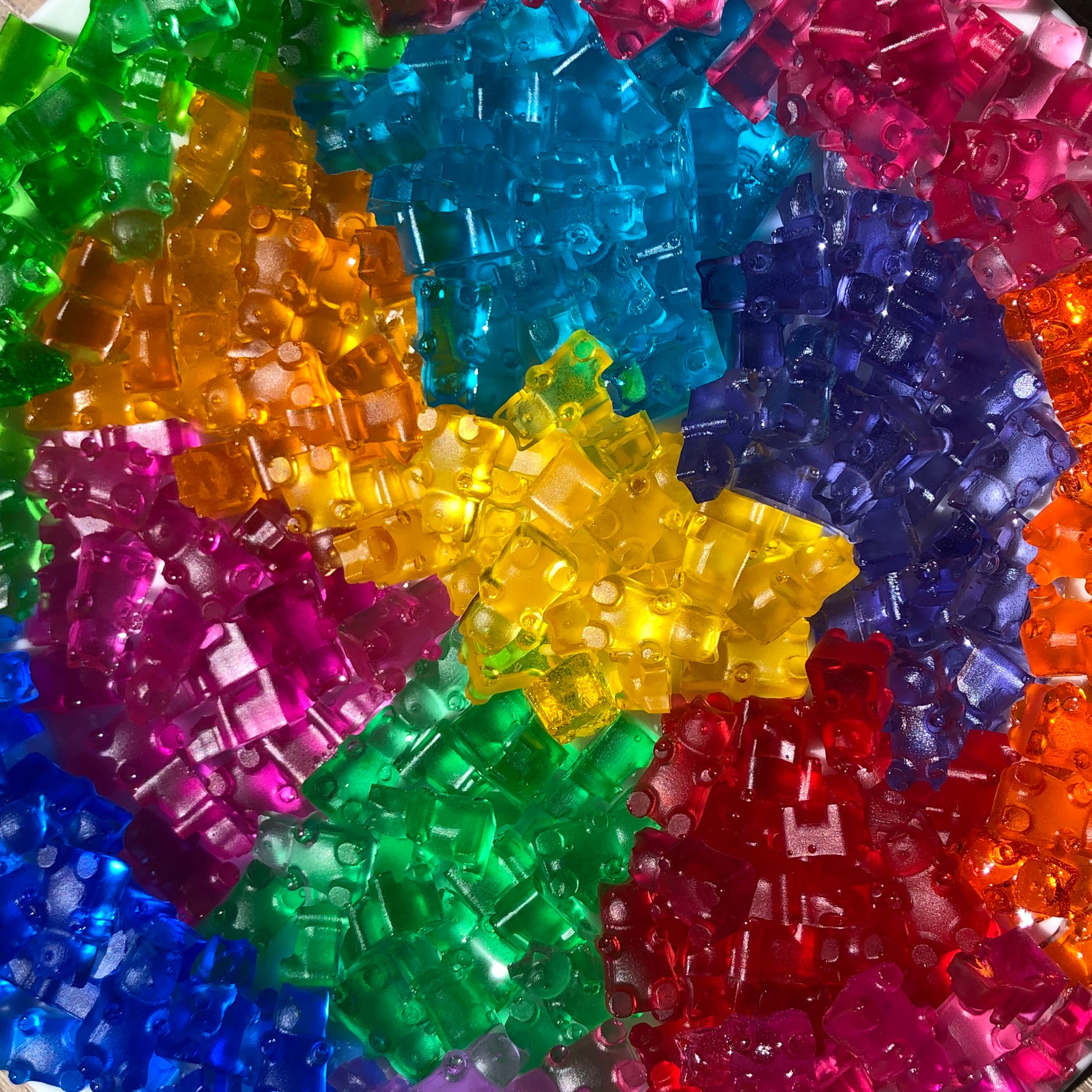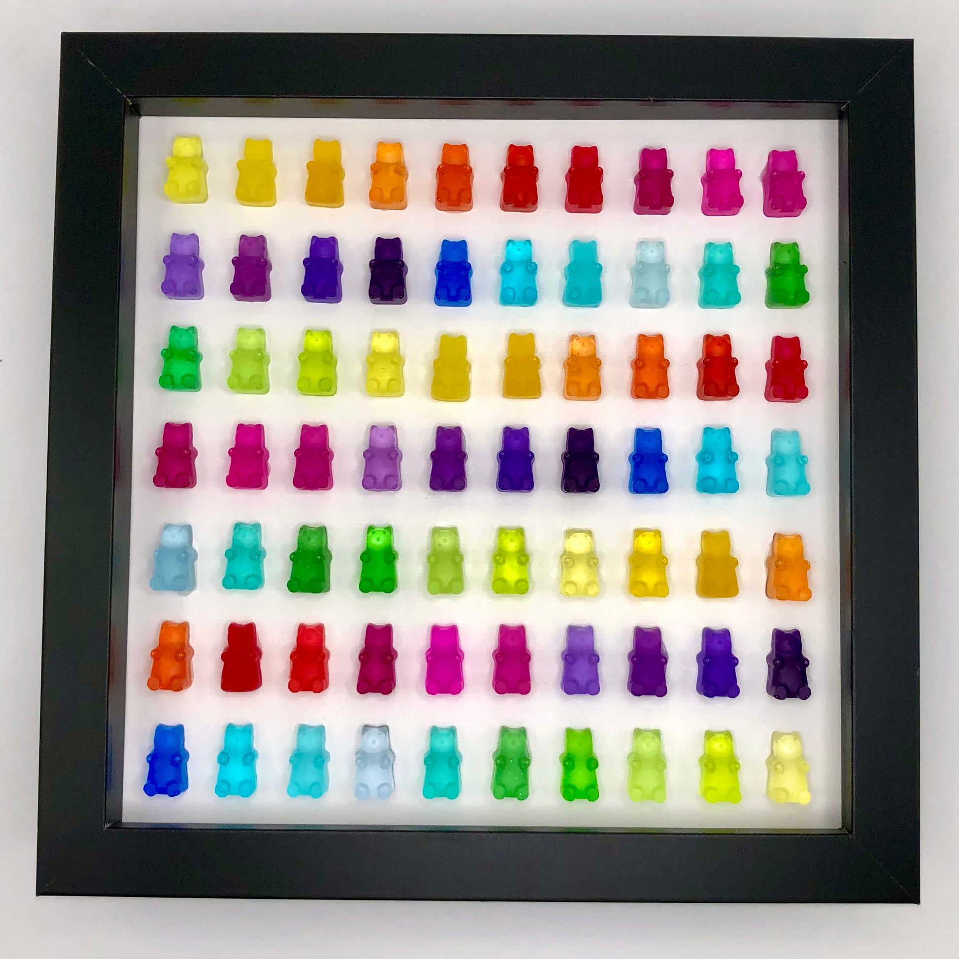 70 gummy bears framed in an 8x8 frame, 1.25" depth.