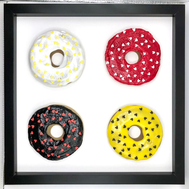 Large donuts in 12x12 shadow box frame - White, Red, Brown, Yellow
