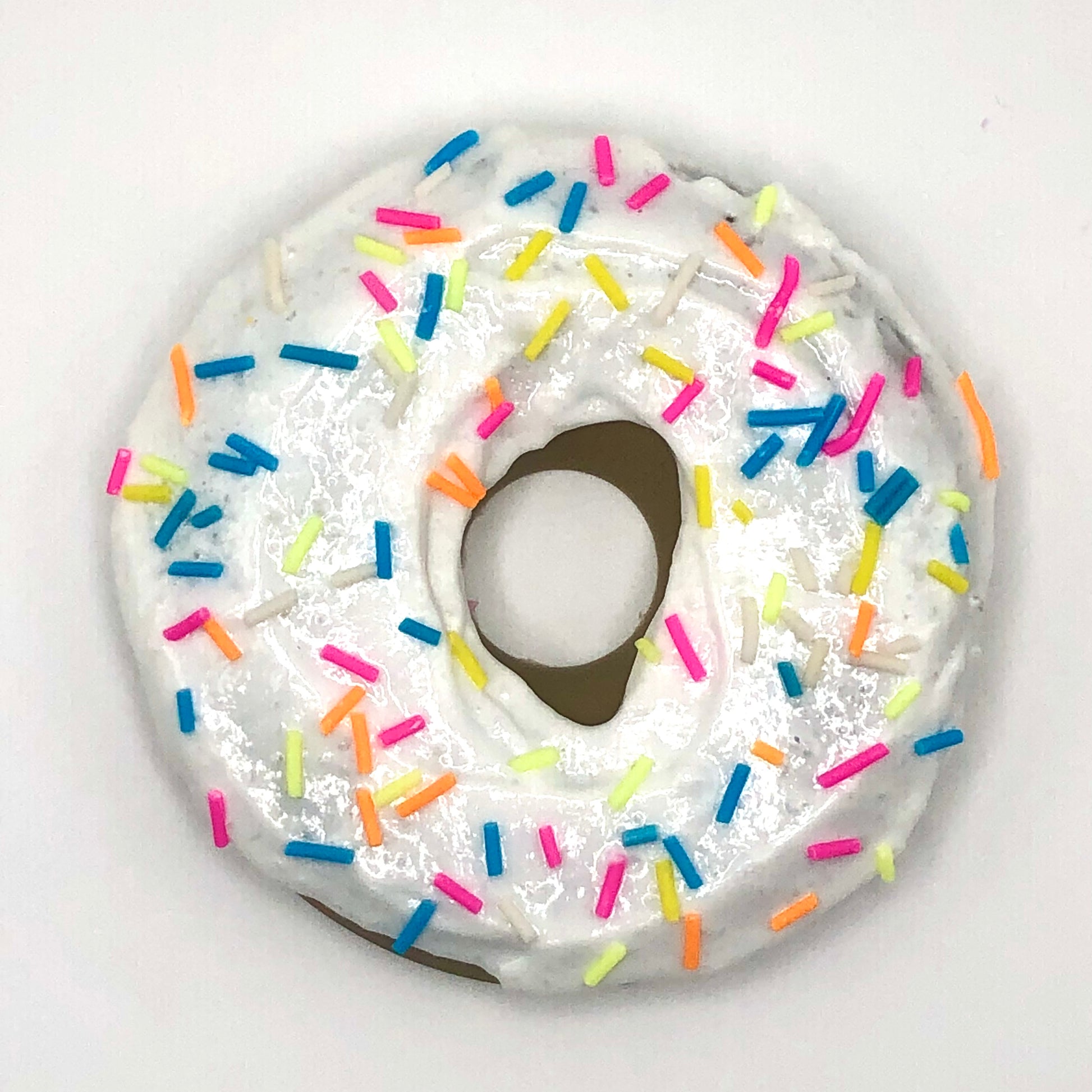 Each donut is sculpted and formed from epoxy resin and decorated with sprinkles made from polymer clay or glass beads. These are NOT edible. The donuts are handmade so each piece is one of a kind.
